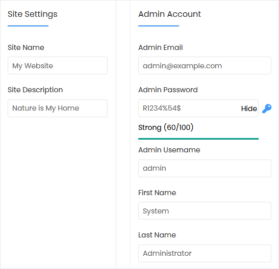 - Admin Username: Your new Dotclear username (for security reasons, do not use the administrator or the admin username).